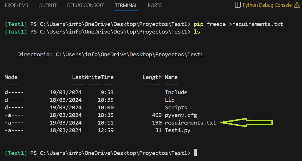 Ya tenemos instaladas unas cuantas cosas y podríamos poner todo lo que quieras a mayores, pero lo mantendré así para evitar complicaciones innecesarias. Ahora necesitamos generar una lista de dependencias de todo lo instalado en el entorno Test1, y para ello usamos este comando: