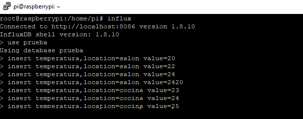 insert temperatura,location=salon value=20 insert temperatura,location=salon value=22 insert temperatura,location=salon value=24 insert temperatura,location=salon value=2420 insert temperatura,location=cocina value=23 insert temperatura,location=cocina value=24 insert temperatura,location=cocina value=25