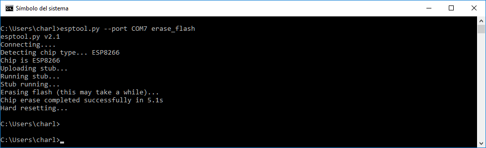 El fabrícante recomienda borrar la memoria flash actual de nuestro micro y nosotros somos de lo más obedientes, Abre una consola de comandos y escribe: