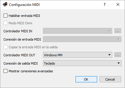 Para conectarlo a uno de los puertos virtuales hay que seleccionar “Edición”->”Conexiones MIDI” y en «Controlador MIDI Out» seleccionar «Windows MM» y en “Conexión de salida MIDI” un puerto que hayamos creado.