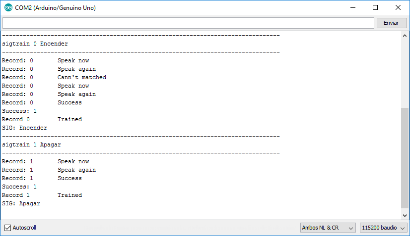 Cada vez que queramos grabar, cargar, modificar o borrar los comandos que tengamos en el módulo, tendremos que arrancar uno de los ejemplos que vienen con la librería: vr_sample_train. Después de cargar el programa, abrimos el monitor serie y lo configuramos para trabajar a 115.500 baudios. Nos encontraremos con una pantalla como esta: